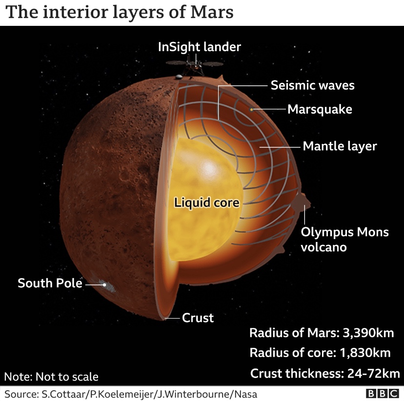Extrapolating to the known surface geology of the rest of the planet, this suggests an average thickness of between 24km and 72km. By contrast, Earth’s average crustal thickness is 15-20km.