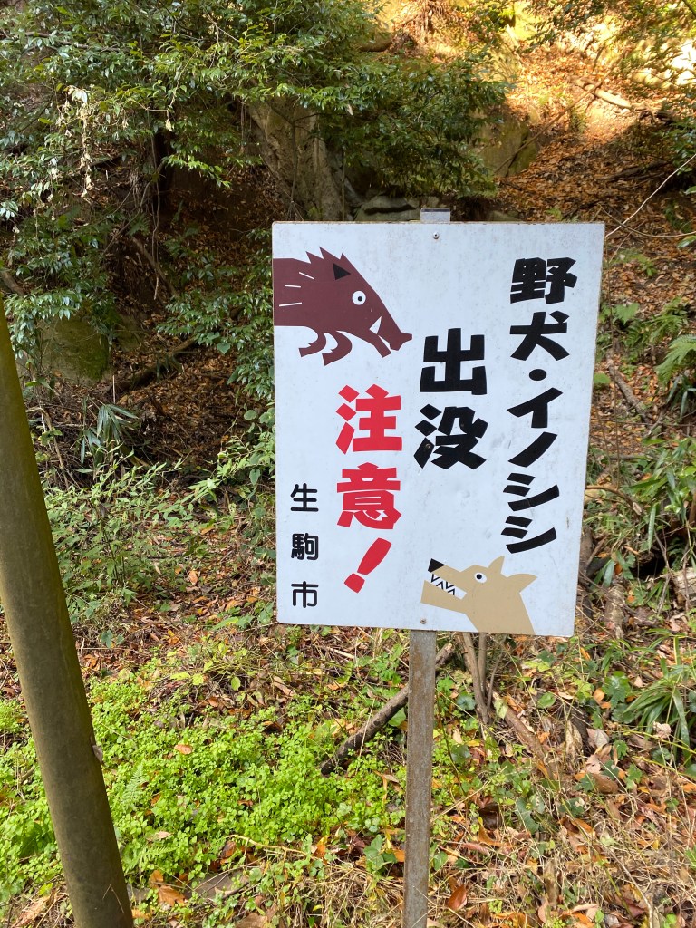 In the meantime, here’s a picture of what it looks like on the hiking trail behind my house. (“Wild dogs and boar suddenly appear. Beware!”)
