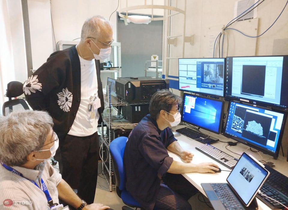NASA scientists have confirmed not just frozen water but liquid — inside crystals called pyrrhotites. JAXA scientists (pictured above with Prof Tsuchiyama of Ritsumeikan University, my main employer!) continue to check the density of the samples.