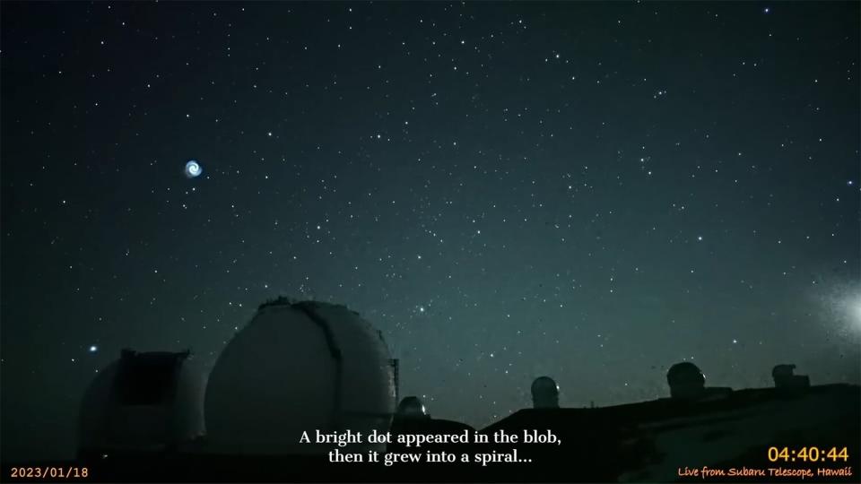A Japanese telescope positioned on top of Mauna Kea, a dormant volcano on the Big Island of Hawaii, captured video of an eerie flying spiral in the night sky on Jan. 18.