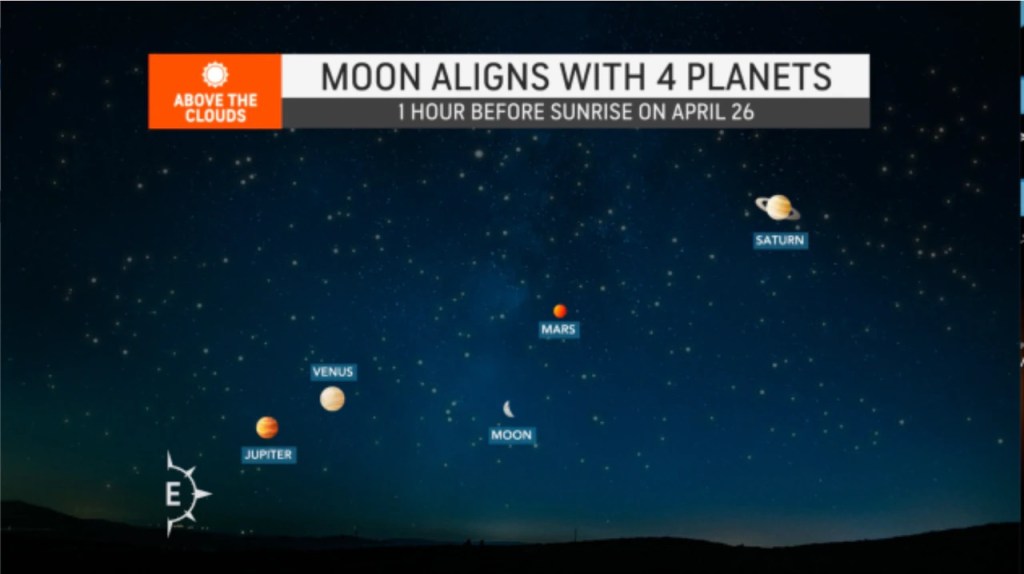 According to nj.com, “The planetary parade of sorts will occur when Jupiter, Venus, Mars and Saturn all appear to be lined up in a row above the horizon during the pre-dawn hours — starting Saturday morning, April 23. The alignment will also be visible during the next few mornings, and April’s crescent moon will soon join the parade, according to experts from LiveScience and AccuWeather.”