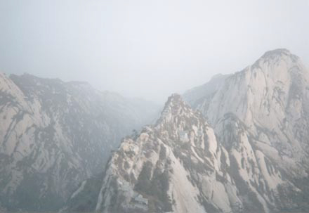 My legs, especially my left calf, still ache from Hua Shang. That experience alone justifies my whole trip. I walked 6 km starting at about 1pm. Stopping only once for maybe 15-20 minutes for a Sprite and a flashlight, I reached the North Peak (Bei Feng) at a little after 5. I really should have continued to the South Peak (the highest at 2160m), but at just before a particularly treacherous climb, a stranger offered to take my picture. He did this twice later; he then asked me where I was going, so because I told him North Peak, he led me to the North Peak Hotel. I signed into an expensive room, thinking a locked door proof against bag theft — but unnecessarily, as there were no other guests at all! I got a TV, a washbasin (no running water) and access to outdoor lavatories (Must have been the “private bath” the guidebook lied about). Public toilets basically meant an open outhouse shitting down the rock face — so much for sacred mountain vibes.